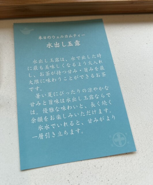 QRコードで注文するとまずウェルカムティーが運ばれて来て本日は水出し玉露