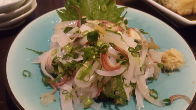 イカそうめん。和えてくれています。茗荷やネギ、ショウガが添えられており、味が増します。