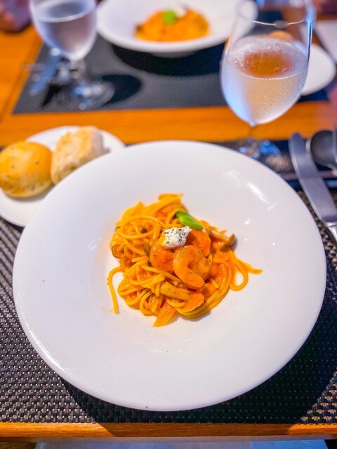 パスタは、プリプリのエビと香り豊かなきのこを、濃厚なトマトクリームソースで包み込んだ満足度抜群の一皿です。