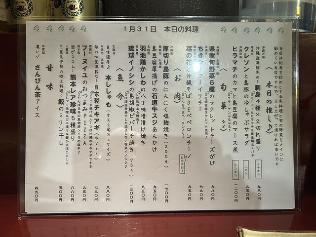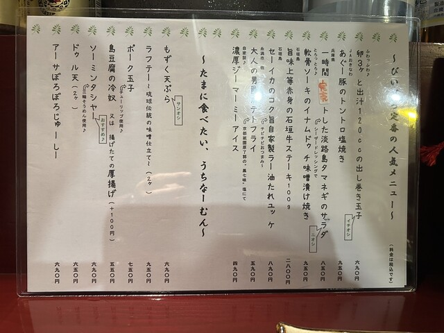 普段飲まない泡盛も、こちらで飲むとすごく美味しい。若い作り手さんが増えているそうで、個性的な泡盛に合う飲み方で提供いただくと格別です。そして料理も進む。料理は地元の食材が使われていて、メニューを見るだけでも楽しい。そして美味しい。要予約です。