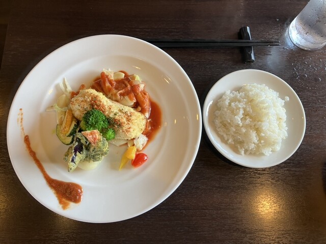 お昼は予約のコース料理もありますが、ランチメニューから選択もできるので、「お肉ランチ」と「お魚ランチ」をそれぞれ頼みました。