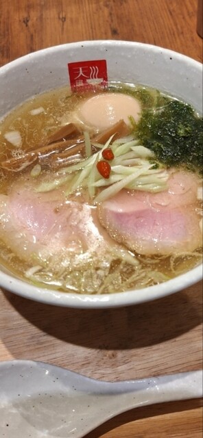 透明感のあるスープに、塩の優しい旨みと香味油の風味が広がる一杯。麺は平打ち麺でしなやか、スープとの相性抜群。柚子胡椒を入れると、大人の塩らあめんになります。