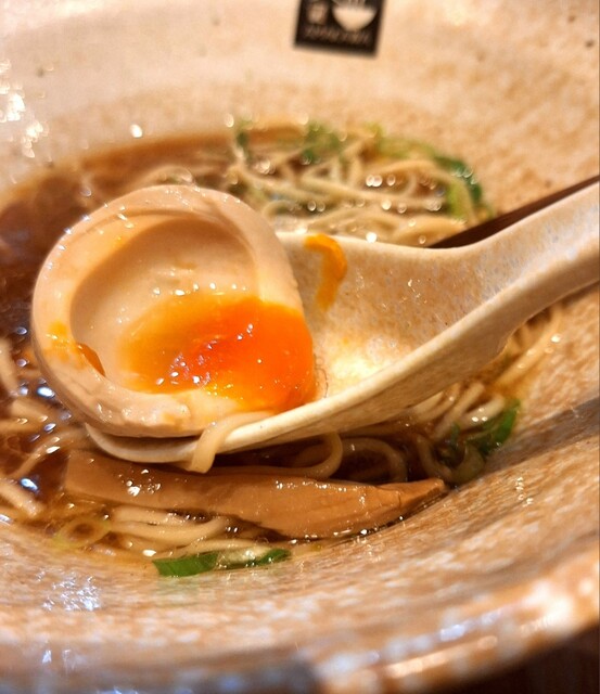 澄んだスープで鶏の旨みがしっかりと立ち上がり、醤油の香ばしさとコクが絶妙。つるりと喉越しの良い平打ちぢれ麺との相性が抜群でした。トッピングの味玉は半熟具合が理想的で、黄身の甘みがスープに溶け出すとさらに旨みが増します。
