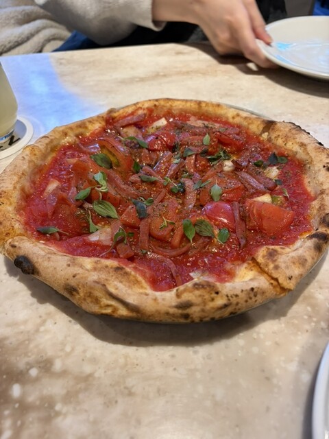 シンプルなトマトピザだがトマトも甘くサラミとよく合う。生地はハード系で噛む程に味が出る。