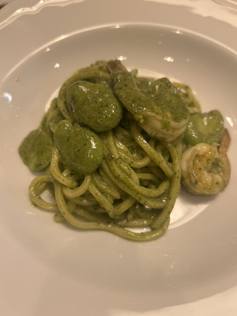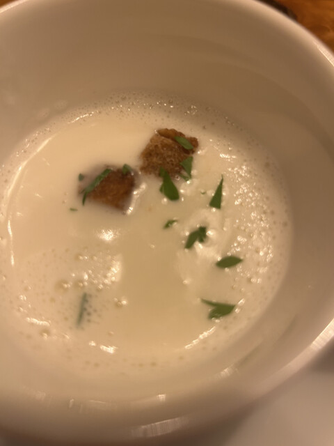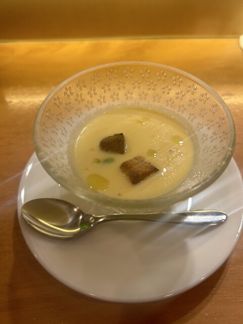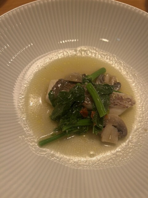 新じゃがのスープはアンチョビ風味のクルトンと新生姜の搾り汁を少しかけてあり体験のない組み合わせで、この時期の味覚を堪能できました。