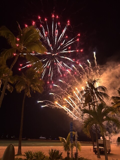 実際花火が始まる3分くらい前にスタッフが花火がよく見れるテラスまで案内してるれます。ビーチでは早くから場所取りやスタンバイされている方もいますが、こちらは直前までゆっくり食事しながら待てます。ちょうどレインボータワーの真下のテラスで皆さん食事中のワイングラス等を手に持ち花火を楽しんでおられました。
