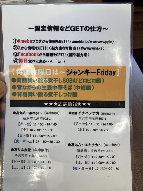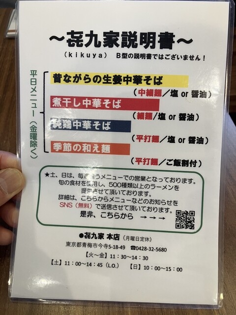 入間市にいるってこともあり、久しぶりに宮寺にあるラーメン屋に行こうかと思いましたが、めちゃくちゃ混んでると読んで、少し遠出しようってことになり、そうであれば青梅市にある『㐂九家』さんに行こうってなり、念願の本店さん訪問です^ ^