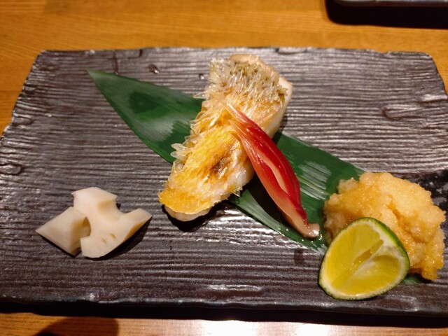 お刺身からは始まり、土瓶蒸し、甘鯛の鱗揚げ、とよく考えられた構成、素材選びに感心。今日のお刺身の中ではアオリイカが特に良かったです。土瓶蒸しの中を写真に撮りましたが、湯気で白くボヤケていますが、とっても上品なお出汁。