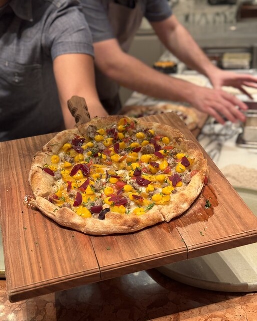 目の前で職人が解説しながらピザを焼き上げてくれるため、ライブ感を楽しむことができます。