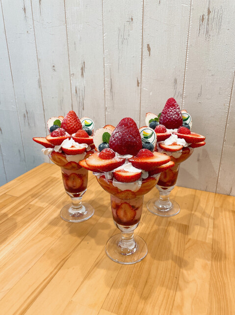 オールあまりんパフェ(埼玉県久米原農園さん) 3種のいちごパフェ いばらキッス(茨城県ふじえだいちご園さん)