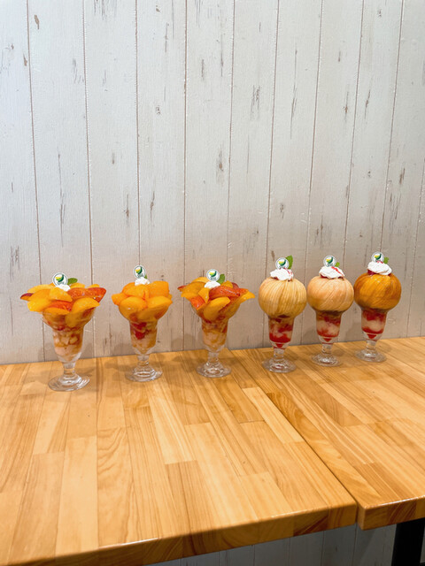 今回は4人で訪問で頼んだのは5個。左から当日急遽出来ることになったと言うヴィーナスマンゴーパフェ、川中島白桃、福島黄金桃、皇寿プラムパフェ、青森プレミアムタカミメロンパフェ。