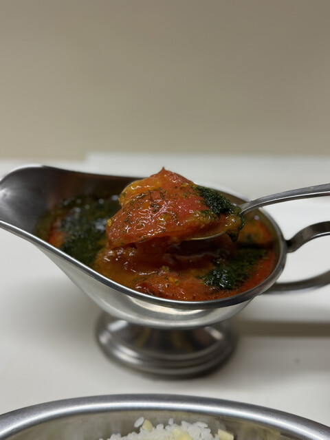 さっそくカレーから食べてみるとカレー本来の美味さをがっつり感じる美味しさ!他の具材ではあまり味わえないシンプルな中身だから感じれるんですね~。豆や挽肉もたっぷり入ってますよ。そこにトマトが加わり抜群に美味しい。カスリメティもいい風味で仕事してますね~