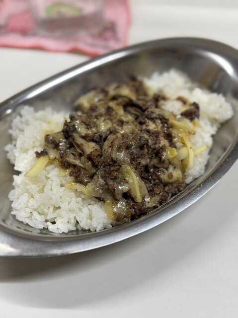 黄昏のユーラシア、ご飯大盛り、スパイシーひき肉、チーズ、ナス