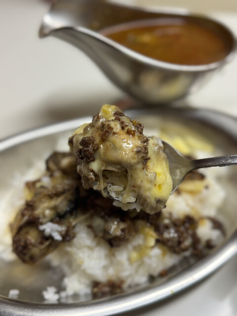 ご飯の方もスペシャル仕様!この仕様を食べれるのはきのこの叫びチーズ入りとオイスターゴッドだけなので貴重ですよね。そして相変わらずめっちゃ美味い。いや美味すぎます。これだけでもう完成された料理なんですよ。そこにかれーで追っかけるともう悶絶。