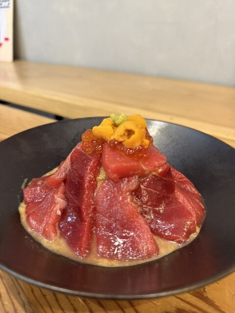 丼にまぐろの山、てっぺんには雲丹とイクラがトッピングされている姿は完全に海鮮丼。