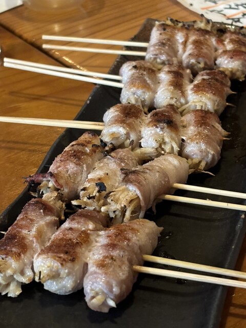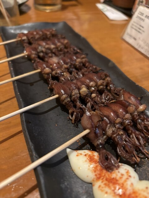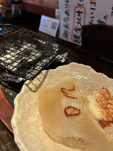 今のイチオシはエイヒレの炙り。手間がかかるんですよ。おもしろい出し方です。出し方はその時次第だから、炭火で炙りたい時は、炭火で出してくれと言った方がいいです。ちびちびちぎって、炭火で炙って、ついでに手羽先の唐揚げも炙ったりして遊びます。火傷には注意してください。塩の効いた銀杏をつまんだりして、ビールを飲んだりします。間で大将のどうでもいい話を聞いたりします。