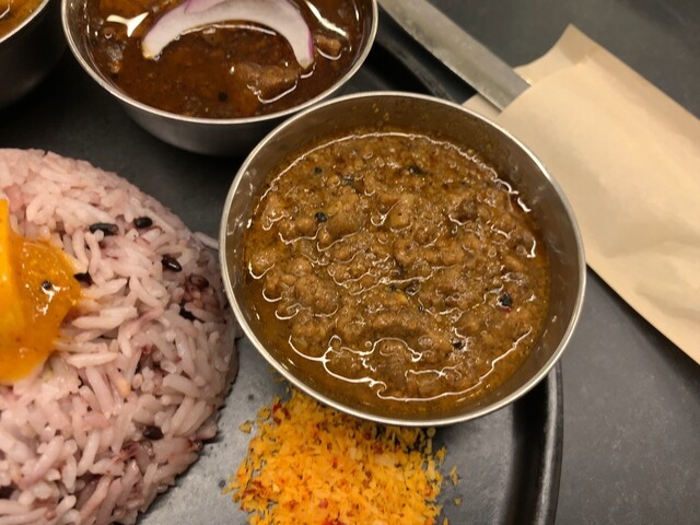 ベンガルキーマ... 豚牛の合挽肉をベンガル地方のスパイスで味付けしたキーマカレー。クミンなどに似たスパイスの香りがし、辛みも4つのカレーの中で強め。