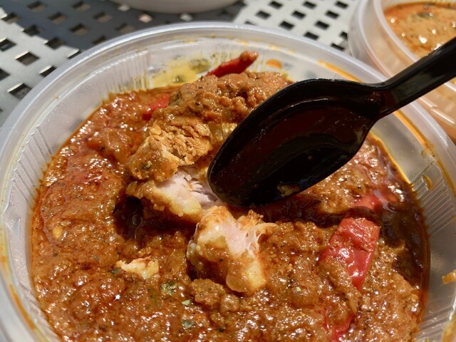 角煮カレーは見た目からして辛そうだなと小並的に思ったが想像以上の辛さ。マジで辛い!!豪快に乗っている唐辛子がインド産らしく、とんでもない刺激。それでいてグローブなどのスパイスが噛んでいると香りが立っているので、決して刺激一辺倒ではない。