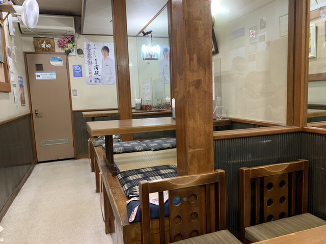 座席は、テーブルと小上がりの座敷がそれぞれ4名掛け×2卓ずつで合計16席。