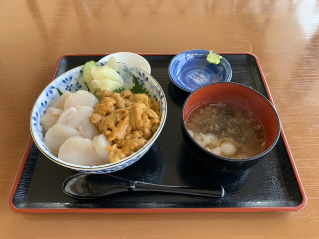 うに・ほたて丼は、おしんこ、布海苔の味噌汁付き。