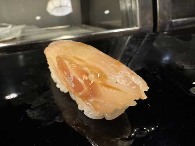 甘海老の塩辛ソースが下に敷いてあるので、握りを食べた後はシャリだけの軍艦で拭き取って食べます。