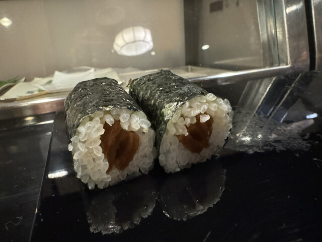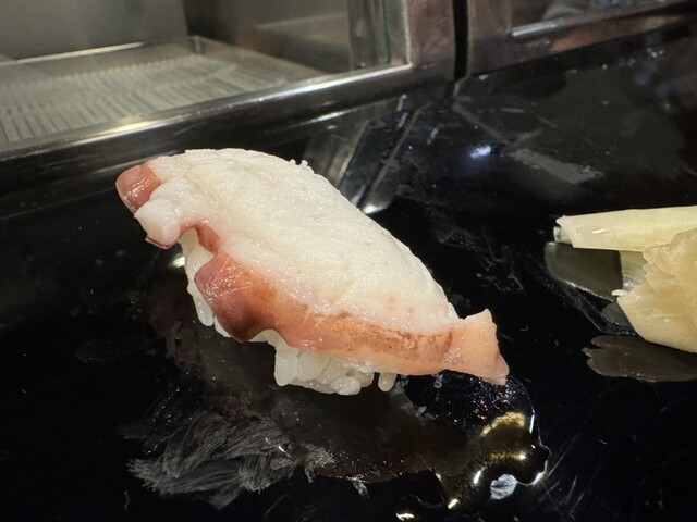 端っこを少し焼き、中に大根のたまり漬けを挟んだ握り。