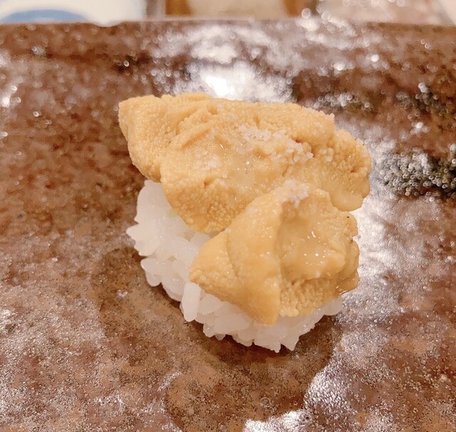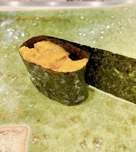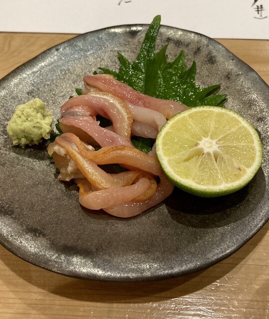 アマガレイ ケンサキイカ 南マグロ 活け鯵 赤貝 平貝の貝柱 富山白エビ ここで大好きな淡路由良の紫ウニを入れてもらいました