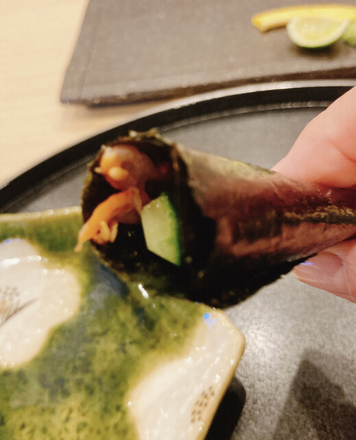 ヒモと海苔をきゅうりで巻いて提供して頂き、赤貝本体とはまた違った食感でこういうの、嬉しいですね。
