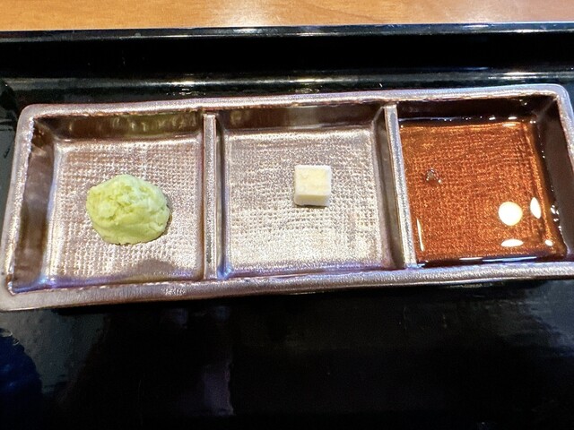薬味は山葵、バター、醤油(タレかも)、岩塩(自分でおろす)。