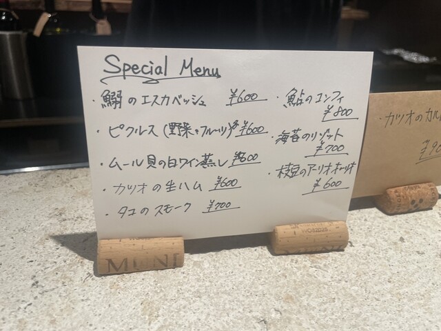 1軒目で来店したので、ワインと前菜3種盛り(ナスのフンゲット、きのこのマリネ、20世紀梨のカルパッチョ)とカツオの生ハムを注文。
