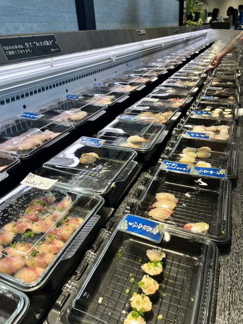 まぐろ、サーモン、こういか、鯛、かわはぎ、あんきも、いくら、うに、あわび、とびっこ、かにみそ、馬刺しまで…めちゃくちゃ新鮮で美味しいお寿司が、どれを取っても1貫110円(税抜き)という気前の良さ!!めーっちゃ美味しくて、これは並んででもまた食べたい!!と思いました。日曜以外は売り切れることはないということですが、やはり早い時間のほうが、あわびやうに、いくらやまぐろなどの高級ネタは充実していて、12時30分ごろにはそれらのネタはなくなってしまっていました。