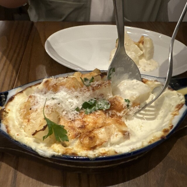 無農薬野菜のサラダ、ポテトと生クリームのグラタン、