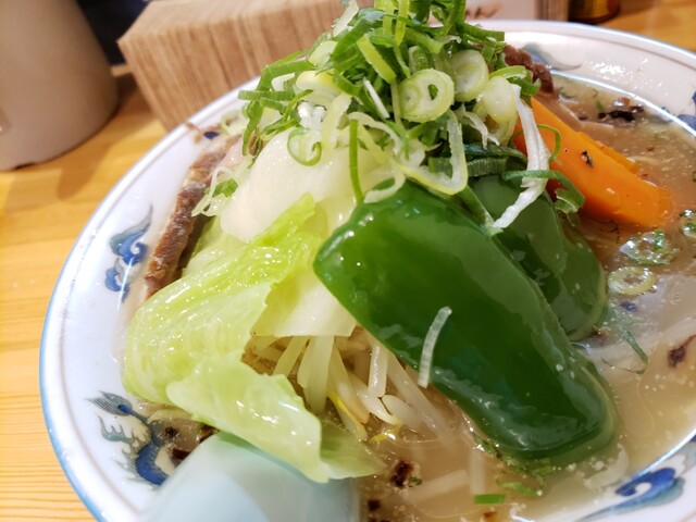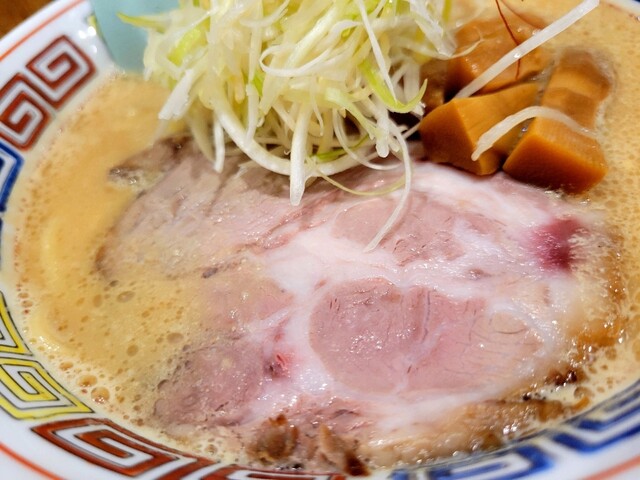 大判厚切りの豚肩ロースチャーシュー、極太しゃくしゃく歯応えの材木メンマ、粗切り玉ねぎ、刻み青葱。