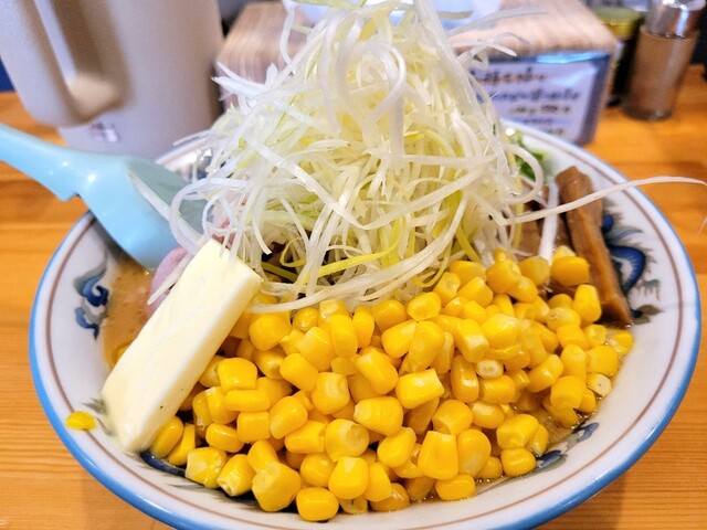 山中には、これでもか!というほどのコーンに、板型の大きなバターが寄り添い、豚肩ロースと豚バラのWチャーシュー。