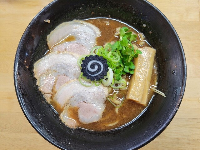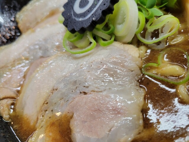 チョコレートの様な濃い茶褐色の豚骨スープが、白い器に映える。脂分がとろける薄切り豚バラチャーシューが3枚、極太ドデカ材木メンマが2本、刻み青ネギの上にナルトを飾り、粗微塵切りの玉葱を散らす。