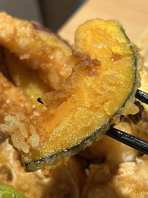 野菜の天ぷらもそれぞれが素材の持ち味を生かしており、さつまいものほっくりとした甘み、なすのジューシーさ、れんこんの歯ごたえ、ししとうの爽やかな苦みと、味と食感が絶妙です。