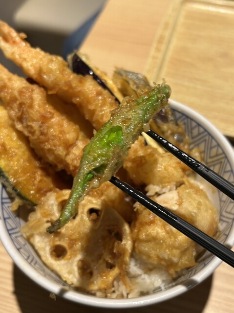 彩り豊かな天ぷらが丼の上に贅沢に並び、見た瞬間から食欲をそそる一品です。
