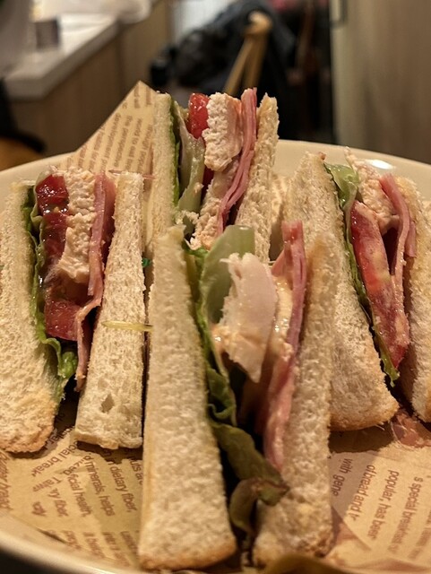 「クラブハウスサンド」はボリュームたっぷりで、ベーコンや卵、野菜の旨みが層になって口いっぱいに広がります。