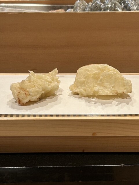 海老やアオアシは衣がとても軽く、噛んだ瞬間に素材の旨味がふわっと広がる上品な仕上がり。イカの磯辺揚げは香りが良く、フグの一夜干しは旨味が凝縮され、深みのある味わいが印象的でした。群馬県産フルーツカブは自然な甘さが際立ち、天ぷらにすることで素材の良さがより引き出されています。カシワ天ぷらは柔らかく食べ応えがあり、茨城県産レンコンはシャキッとした食感が心地よく、油のキレの良さも感じられました。