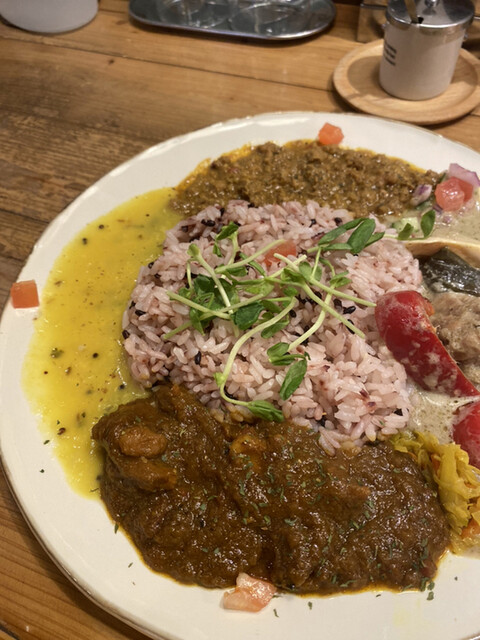 カレーは、スライス効いててめちゃくちゃおいしい!!辛さもほどよくピリリとする感じで、コクもあり、3種とも甲乙つけ難いおいしさ。