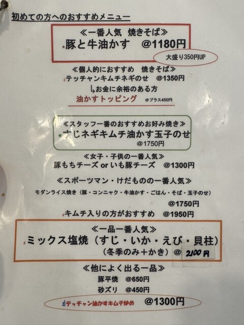 お好み焼き焼きそばとしては定番のメニューのように見えますが、提供されてびっくり。