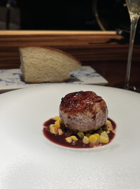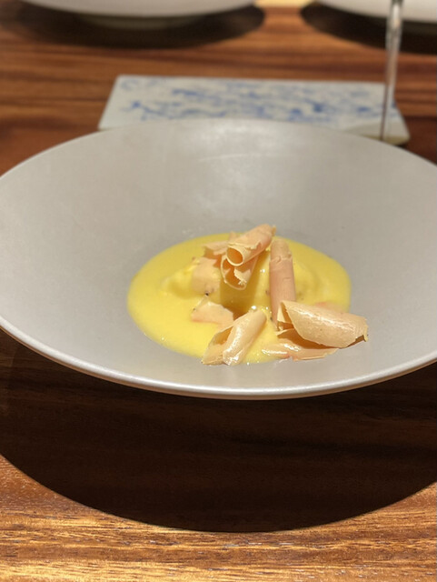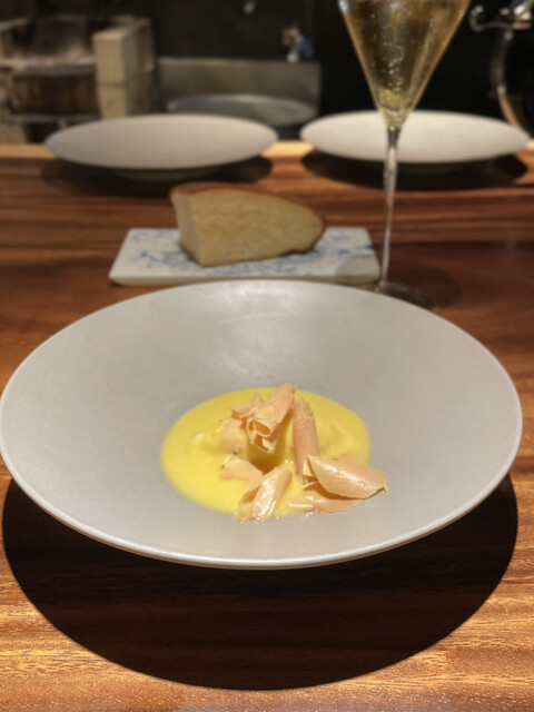 ▶︎とうもろこしのスープ、甘くて優しくて美味しい。フォアグラの香りがいい〜!削りたての生ハムがめちゃくちゃ美味しくて、スパークリングがすすんじゃう!
