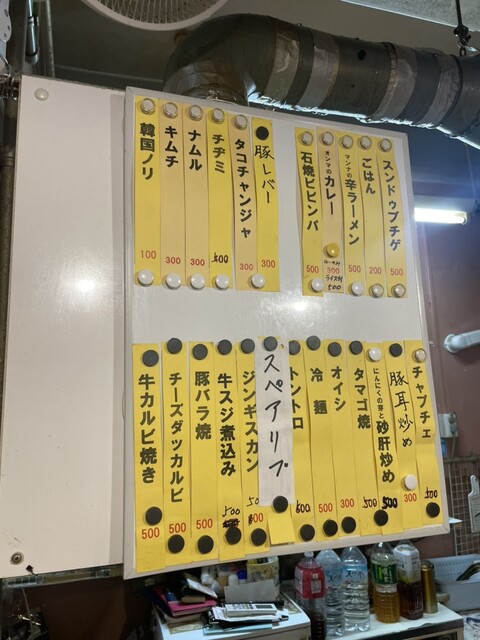 追加した焼酎中(200円)でホッピーを飲み干し、これでお会計というところだが、どれも美味しいのでチャミスル(800円)と豚耳炒め(300円)を追加
