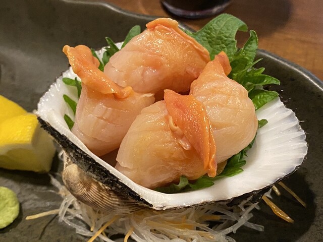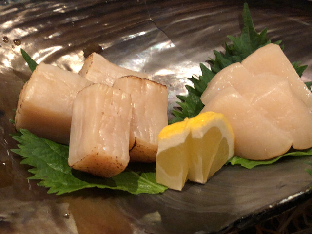 今回は、ホタテと赤貝の刺身、生牡蠣、太刀魚の塩焼き、海鮮爆弾をいただきました。