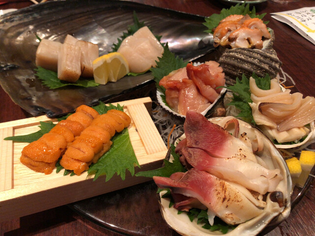 今日も、貝の刺身の盛り合わせ、タイラギのいそべ焼き、海鮮ばくだんなどとともに日本酒などをいただきました。