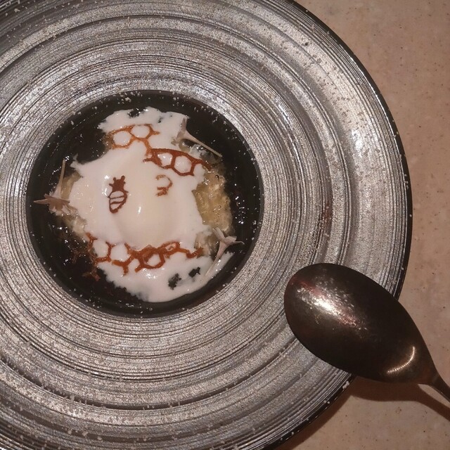 ミルクプリン 白ワインジュレのせ(蜂の巣をイメージしたソースがかわいい…)