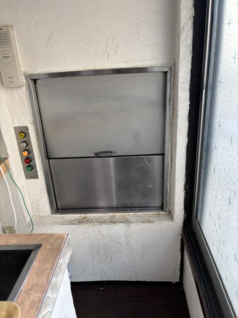2階を選ぶと…なかなか渋い(笑)。座布団席で、奥に料理用リフト(写真2)があり、◯番さん料理あがりました、とインターフォンで呼ばれます。が、聞き取りにくい時もあり、リフトに近い席の人が開けてみて、料理のそばに置いてあるレシートで席番を確認。自ずと隣の席の人とはお話しせざるを得ません。リフトを開けて、料理を取って、閉めるまでが一連の流れです。店員さんと接するのはレジだけ(笑)