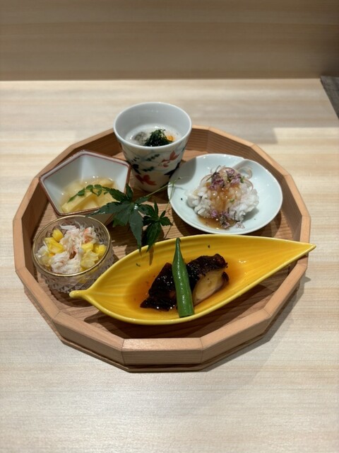 季節の八寸(5品)、鰹刺身、稚鮎の天ぷら