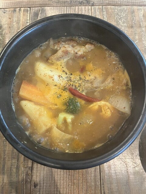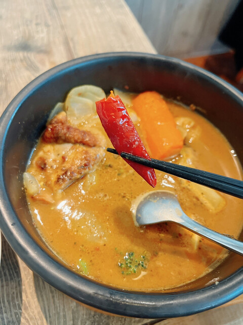 ゴロゴロとした野菜とこんがり焼き上がったチキンが入って、旨味が凝縮された野菜とチキンのスープカレー。