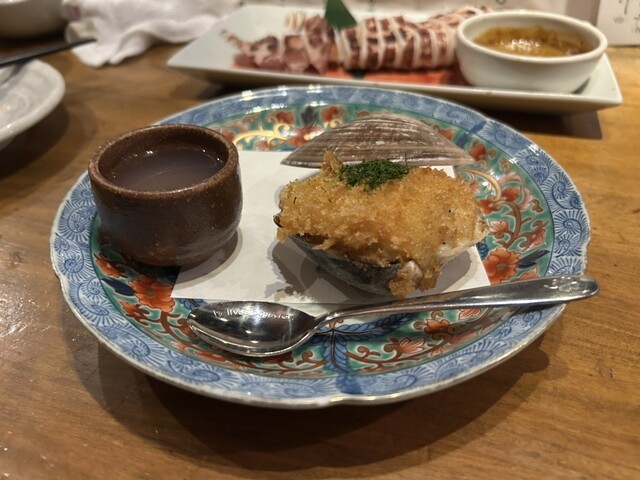 【注文】刺身6点盛り(2,400円)、ホタルイカ酢味噌(780円)、あすぱら(520円)、はまぐりクリームコロッケ(1,100円)、浜焼き鯖(1,760円)、するめ烏賊わた焼き(1,880円)、からすみ蕎麦(2,300円)。その他生中(780円)、獺祭一合(1,630円)その他。合計15,490/2人